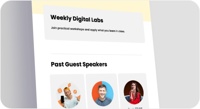 Weekly Digital Labs Join practical workshops and apply what you learn in class. Past GuestSpeakers Jorden Tually Mitch Summers Dear Alyne 3.9M Followers 1.5M Followers 3M Followers Creator Accelerator Program 15