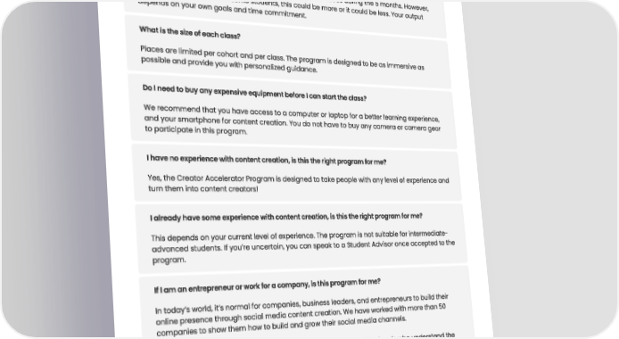 If I’m busy and miss a few classes, can I get areplacement? If you enroll in this program, there is a time committment – including the scheduled sessions. If you are unable to join your scheduled class, you can either watch the recording in your own time or try join a class in a different timezone. What output will I create if I join the Creator Accelerator Program? In this program, you can create at least 50 scripts and 30 videos during the 5 months. However, quantity is not the goal. For some students, this could be more or it could be less. Your output depends on your own goals and time commitment. What is the size of each class? Places are limited per cohort and per class. The program is designed to be as immersive as possible and provide you with personalized guidance. Do I need to buy any expensive equipment before I can start the class? We recommend that you have access to a computer or laptop for a better learning experience, and your smartphone for content creation. You do not have to buy any camera or camera gear to participate in this program. I have no experience with content creation, is this the right program for me? Yes, the Creator Accelerator Program is designed to take people with any level of experience and turn them into content creators! I already have some experience with content creation, is this the right program for me? This depends on your current level of experience. The program is not suitable for intermediate- advanced students. If you’re uncertain, you can speak to a Student Advisor once accepted to the program. If I am an entrepreneur or work for a company, is this program for me? In today’s world, it’s normal for companies, business leaders, and entrepreneurs to build their online presence through social media content creation. We have worked with more than 50 companies to show them how to build and grow their social media channels. The Creator Accelerator Program is a perfect fit for industry professionals who understand the importance of social media for brand awareness and marketing – and want to learn how to successfully do it in an accelerated way. Creator Accelerator Program 19