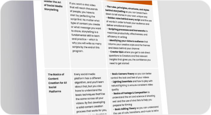 Program Outline Module Summary Key takeaways Master the Art If you want a viral video - The rules, principles, structures, and styles of Social Media that will reach thousands behind storytelling so you can break them Storytelling of people, you have to down to tell stories in your own unique way start by perfecting the - Golden rules behind every script and the use script first. No matter what of words in order to hook your audience and type of content you create deliver emotional impact or what message you want - Scripting processes and frameworks to to share, storytelling is a maximize productivity, effectiveness, and fundamental skill to learn efficiency in writing and practice – which is - Identifying your niche & audience that why you will write so many informs your creative style and the themes scripts by the end of this and ideas behind your channel program. - Creator Q&A where you get to ask direct questions to Creators and find relevant insights that gives you the confidence you need to get started The Basics of Every social media - Basic Camera Theory so you can better Content platform has a different control the look and feel of your videos Creation for All algorithm, and you’ll learn - Lighting Essentials and how to play with Social about that, but you also natural lighting to ensure consistent video Platforms have to understand the quality basic techniques that’ll be - Basics of Footage & Composition to the same across all your understand the art and science of shooting videos. By first developing well and the use of shot lists to help you a solid content creation prepare for filming process that works for you, - Basic Editing Theory so you can understand you’ll be able to develop a the use of cuts, transitions, and music to tell a unique style and keep your story that engages your audience audience coming back for - Editing Workflow so you can understand more. what an efficient workflow entails and overcome the challenges of editing - Export settings across different platforms and devices to optimize video quality Creator Accelerator Program 07